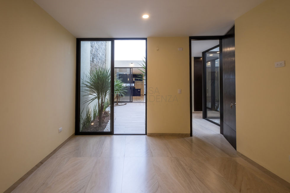 Planta baja: cochera techada para dos autos con acceso directo al patio de servicio, la sala; de altura y media, el comedor y la cocina conectan con el jardín interior ofreciendo un espacio amplio para el esparcimiento familiar y añadiendo un toque de naturaleza y tranquilidad en el hogar. La cocina, además de ser muy amplia, está equipada con una barra desayunador y alacena. Cuenta con un medio baño para visitas, un clóset de cortesía, una bodega ubicada debajo de las escaleras y la recámara principal con vista al jardín interior, un vestidor muy amplio y baño completo.